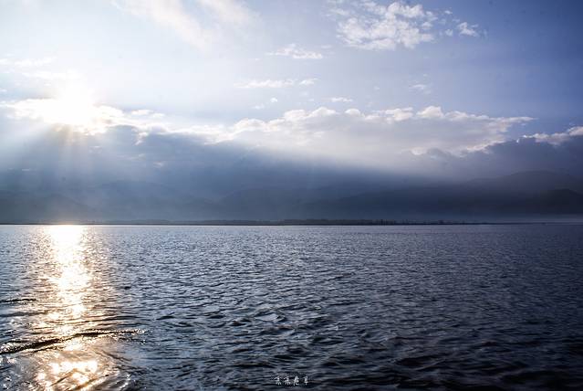 阳光快要穿过云层。瞬间感到亮海湖面改变了她的色彩。