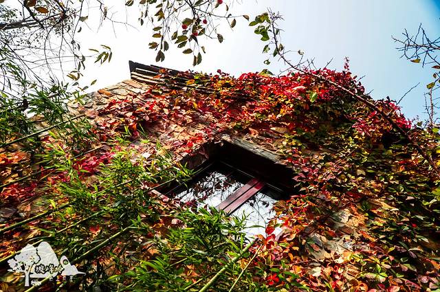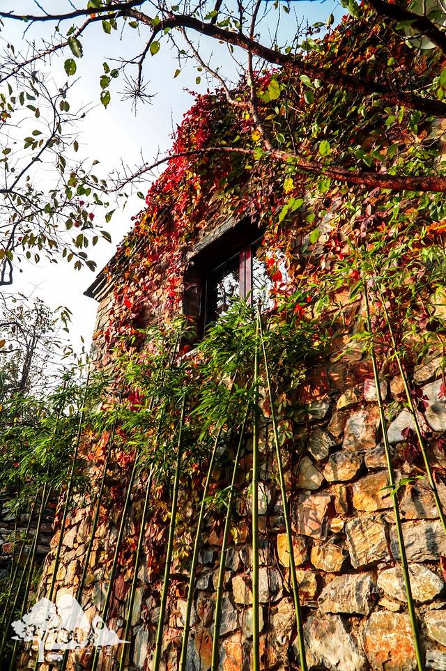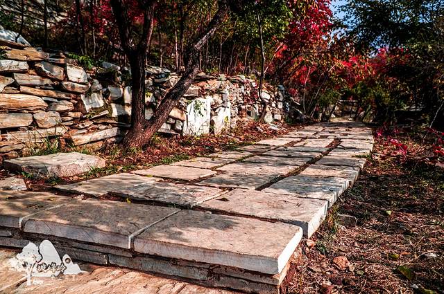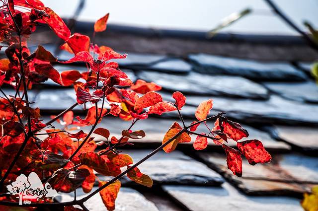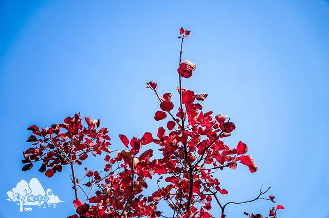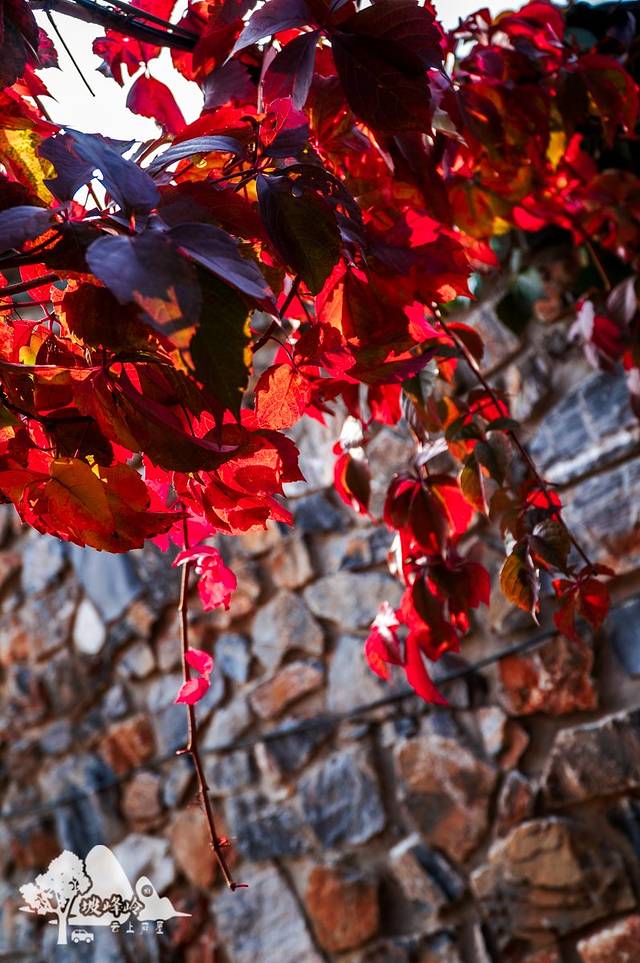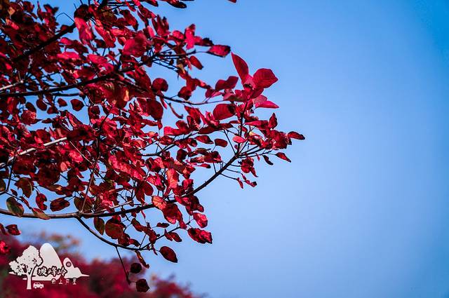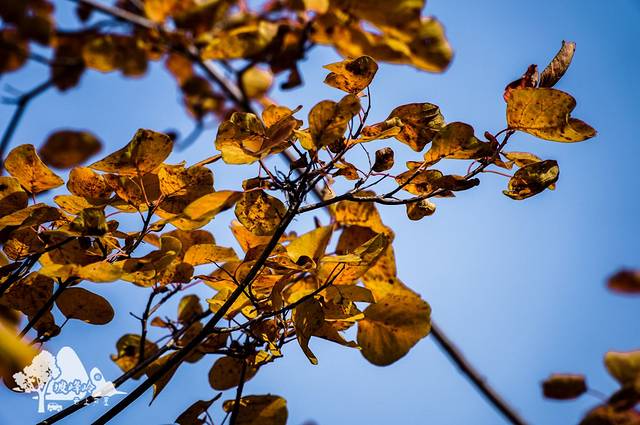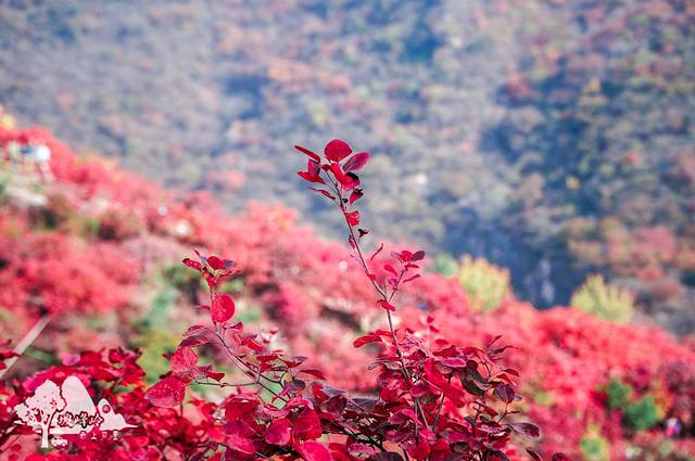 半坡抬阶而上,蜿蜒小路两侧以自然生高大黄栌为重多,伴生麻榆、麻全子、酸枣、山荆等,丰富的植物资源带来了这五彩斑斓的美景。