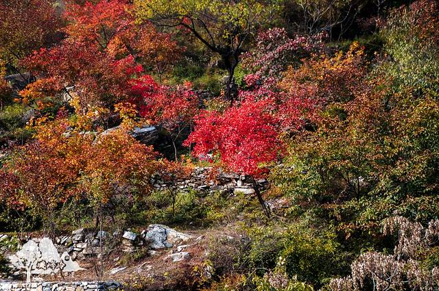 这主要原因还是因为香山多以枫叶为主,红叶时间较为相同,而坡峰岭由于树种众多,坡起处多以柿树、核桃、桃树、山杏、杨树分布,伴生野酸枣、野山梨、野山菊等。