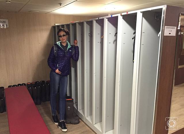 12.防水靴。这个不用带,夸克会给每个人一个衣柜,衣柜里有刚才提到的棉袄,救生衣,还有就是防水保暖靴,上船后,先分组,分组后就可以试衣服和靴子,找到自己合适的尺码就好,这个靴子非常好,很保暖,防水。另外告诉大家靴子一定要穿在防水裤里面,这样才不会让水倒灌。