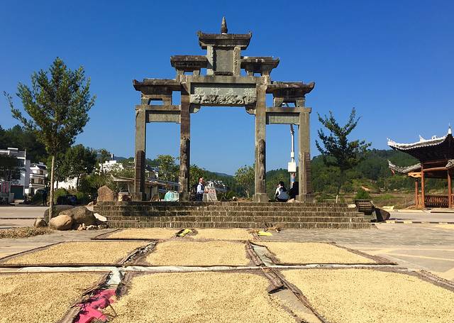 古村路口的牌坊,村民在此晒谷子,稻花香……