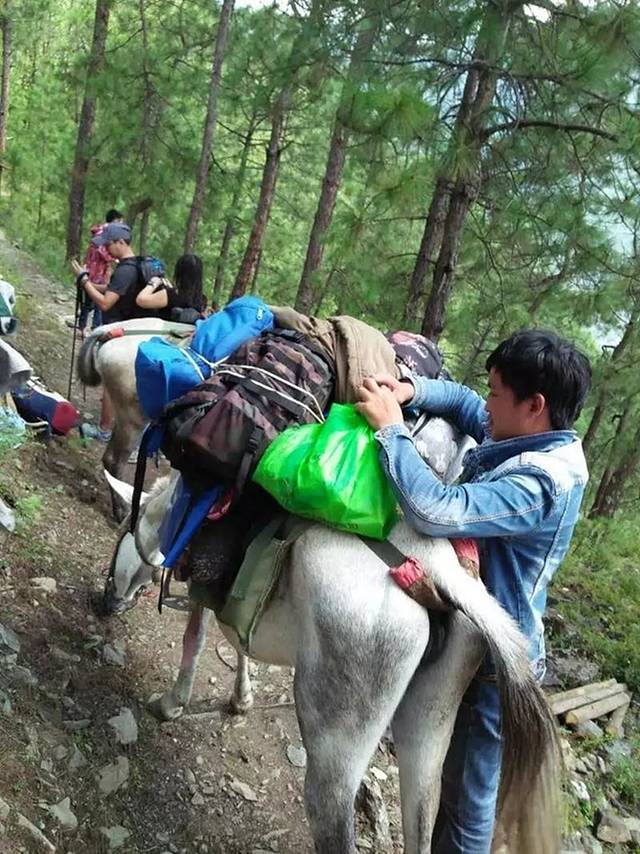 还没到28道拐的时候,就已经累得不行了,所以一致决定把所有的行李放在在马背上,毕竟人家也跟了我们一路了,从我们上山开始,这个纳西族的小伙子就牵着马一直在后面跟着我们,这属于是赌博性质,就看在路上谁支撑不了然后骑马,价格在200~300不等