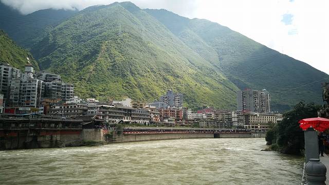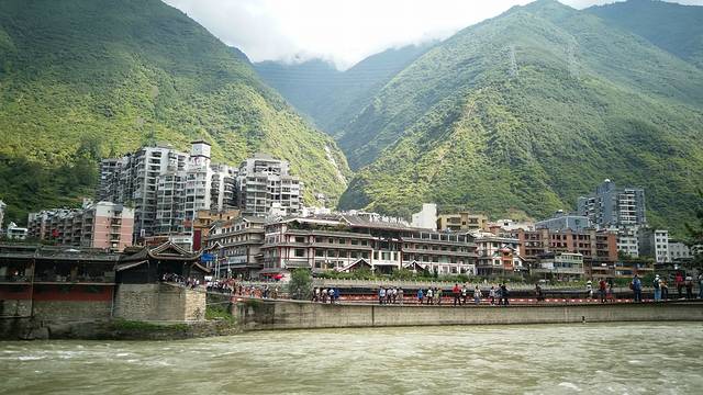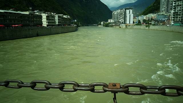 大渡河上的铁索桥—狭窄的河谷 水深、流急!你还能看到吗?沿河两岸已兴起了很多的高楼建筑!
