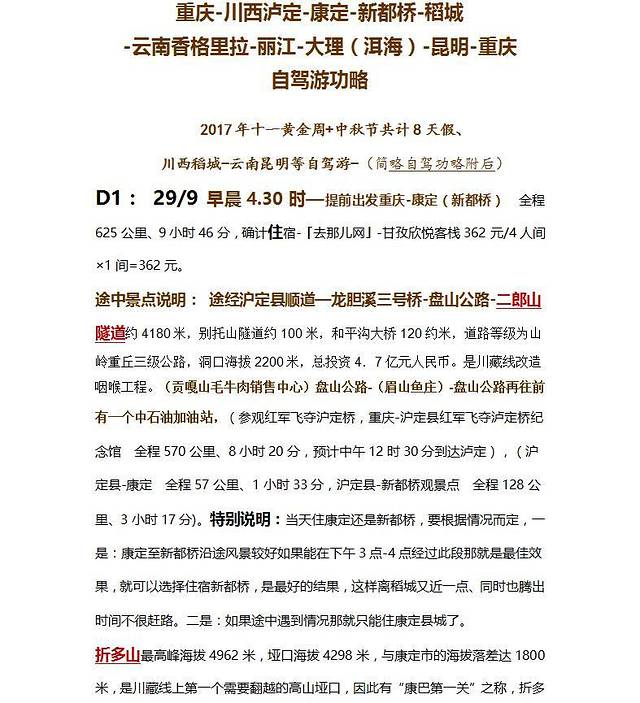 功略只显示一部分!川西行虽然不是第一次,还是做一个功略很重要的!尤其川西的高海拨、高寒地区安全更为重要!至于川西自驾行的感慨随着每日的行程可以看出端倪!