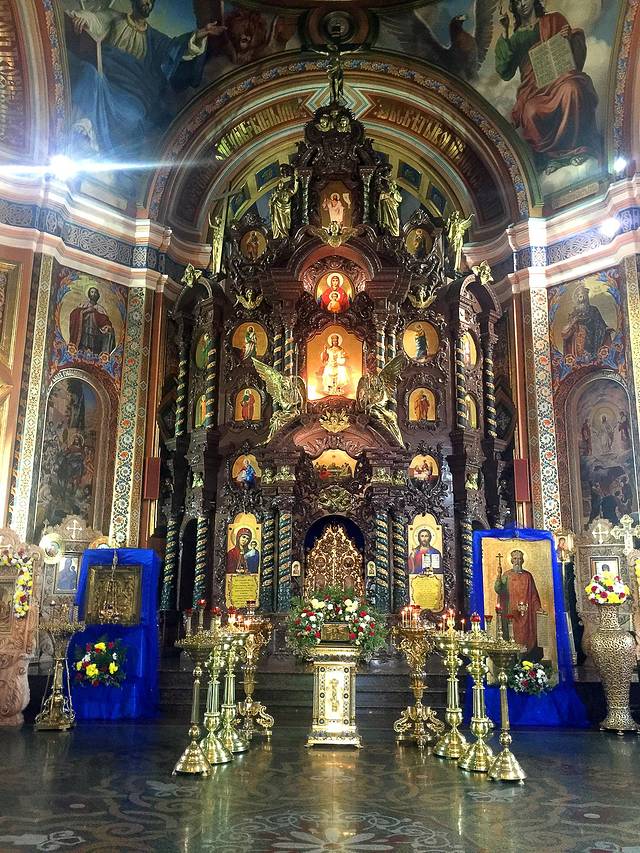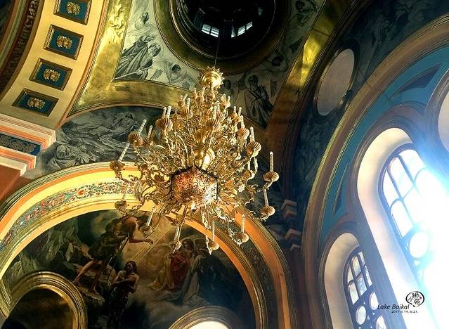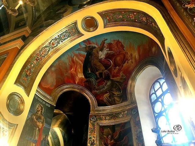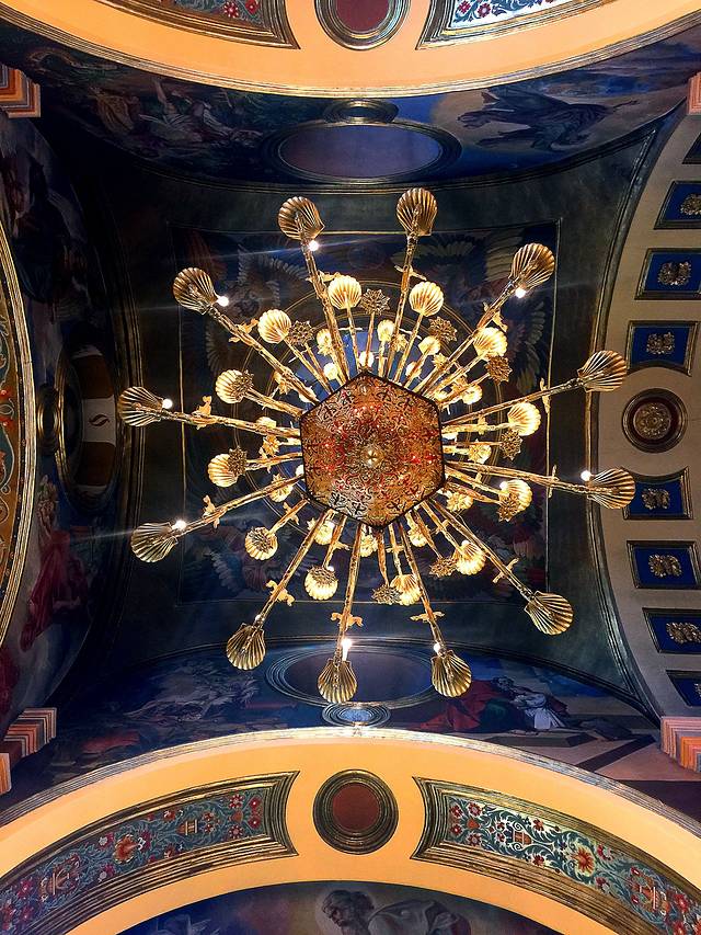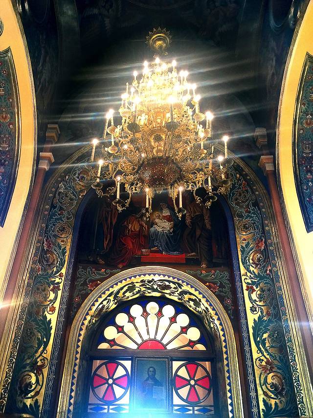 里面更是金币辉煌,绚丽的色彩和天光的引入,使整个空间变得飘忽、轻盈而又神奇,增加了东正教的神秘气氛。圣坛中央悬挂圣像,四周簇拥着圣徒画像。镶金的拜占庭穹顶,象征着神圣、高贵、富有,庄严神圣的感觉让人一进入就忍不住90度仰望穹顶。巨大的水晶灯闪烁着耀眼的光,照亮着一幅幅生动的壁画,描绘着来自天堂的故事。