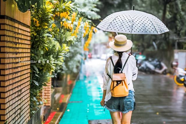 从饭店借的雨伞颜值好高,和小清新的街景很搭。