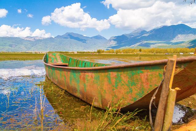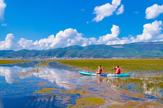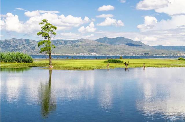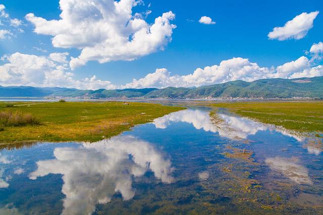 如镜的湖面倒映着玉龙雪山,拉市海是一片蔚蓝的高原湖泊。无数的水鸟翱翔于蓝天白云之间,构成高原湿地特有的气息。骑上马绕湖一周,一路可见森林茂密,花草繁盛,群鸟盘旋飞舞,掩映长空,蔚为奇观。小船随风飘荡着,天水一色,远山近水,白云蓝天,像画一样,景色是很美。