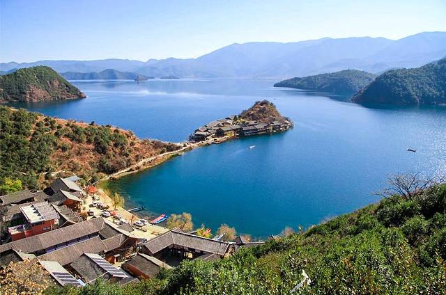 形态各异,湖中各岛婷婷玉立。林木葱郁,翠绿如画,身临其间,水天一色,清澈如镜,藻花点缀其间,缓缓滑行于碧波之上的猪槽船和徐徐飘浮干水天之间的靡梭民歌,使其更增添几分古朴、几分宁静,一个远离嚣市,未被污染的处女湖。丽江泸沽湖置身于此,仿佛置身于天堂。