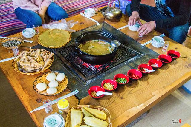等汤汁再次沸腾,香味也一下子就蔓延了整个屋子,总是忍不住先来一碗香浓的汤,吃者烤得黄脆的土豆,甜脆玉米,还有纳西粑粑,这是很享受的一顿美食,在热腾腾的气氛里,人们之间的距离好像也会被拉近,边聊边吃,你甚至会发觉,原来和身边的亲人朋友有那么多话说的,真正感觉到家的温暖,这也许就是丽江火塘的魅力。