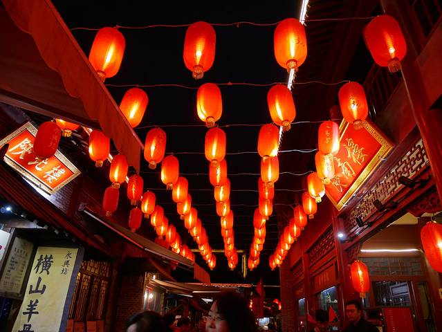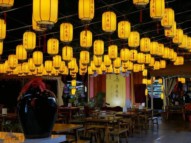 入口旁的酒家,挂满了橙黄色的灯笼,充满了古香古色的韵味,仿佛让人一下子梦回长安大唐盛世。