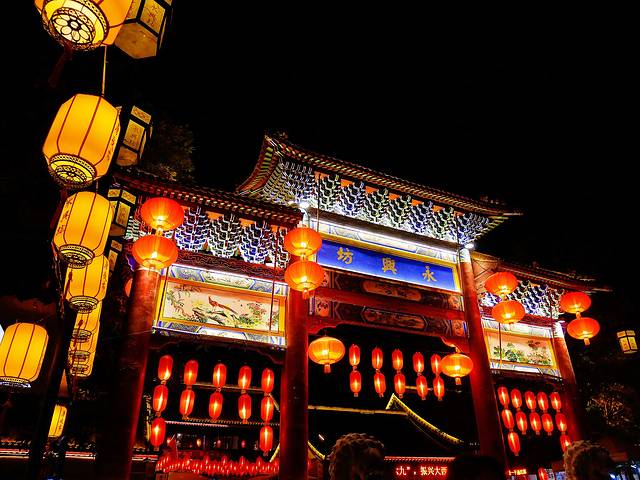 夜色下的永兴坊牌坊,也是入口处,进去之后就是窄小的民俗小吃街。古典的牌坊在灯光下一下就让人生出了久远的年代感。