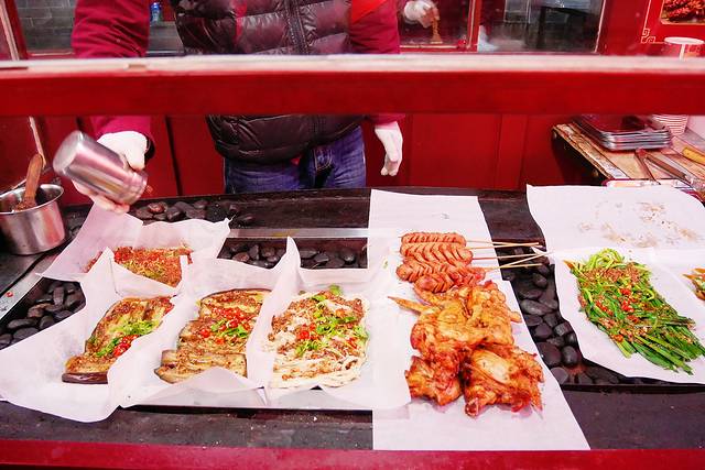 第二道菜我们品尝了细致金针菇和鸡翅,鲜艳的食物放在黑色的烤石上看起来真的太有食欲了,而且这里给我印象比回民街好的一个原因是十分干净,地上几乎没有垃圾。