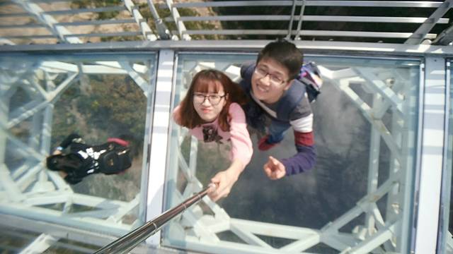 登上玻璃桥的最中央,游客需要穿好鞋套后排队进入。神奇的是虽然脚底下深不可测的悬崖峭壁看的非常清晰,但是却没有意料之中的刺激,也可能是热闹的登山队伍冲淡了这种恐惧。