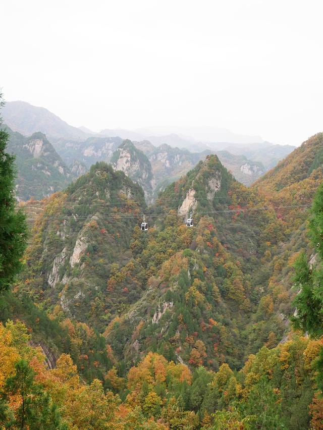 经过玻璃栈道后再步行大约半个小时就抵达了期待已久的玻璃索道。从这个角度望去,只看见一条又轻又窄的白色飘带把两座山头系了起来,在和煦的秋风里摇摇欲坠。