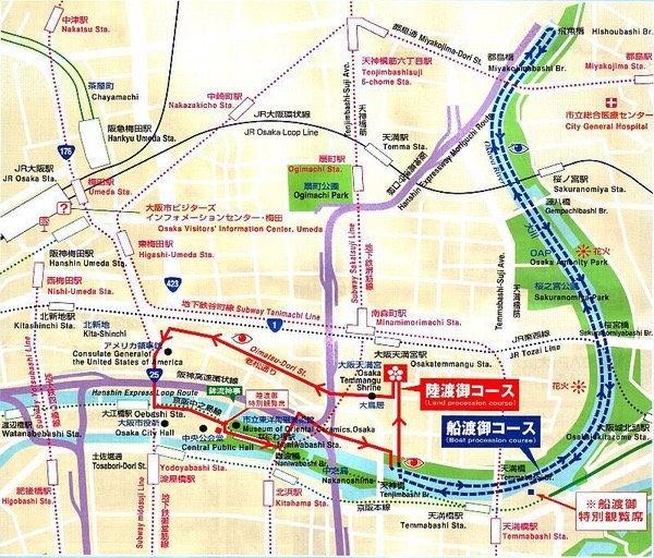 夏天的展恰逢了日本的夏日祭,因为想更多的了解夏日祭的活动,因此我们选了日本三大祭之一的"天神祭."每个地区的祭时间是不同的,活动也有所区别.我只能用图片粗略的介绍一下关于大阪的夏日祭.因为24和25日的天气很好,所以,我们有很大部分时间都跟着祭的游行队伍,天神祭主要是在大阪的天满宫开始,如果想要感受夏日祭的你们最好能找到一个离天满宫比较近的住宿,大致的游行线路,可以看图片,