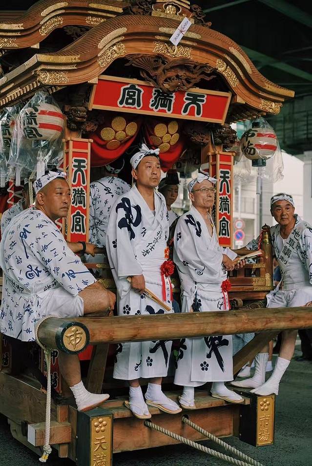 我不确定每年祭祀的流程会不会有变化.因为国内好像查不到相关的讯息,想感受祭的小伙伴可以提前一天到达,整个游行是男女老幼,各个年龄阶层都会参加的,游行也是一个方阵一个方阵的,游行的人反正都特别high,能唱唱跳跳一整天,天满宫附近的商业街以及天满神社都会发放完整的时间表,你们可以按照自己的体力选取感兴趣的观赏或者感受.24号晚上开始,商业街就开始摆很多夜市了,你可以穿着浴衣,捞金鱼,吃糯米丸子,章鱼烧,糖苹果等等,不过人流比较拥挤.想去看花火大会的你们,建议提前2个小时备足便当去占个好位置,如果住的比较远,请记得买好回去的票,真的人山人海,没带角架,在人群中颤抖着拍完烟火,我们都感觉腿儿都不是自己的了.