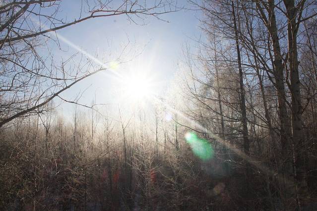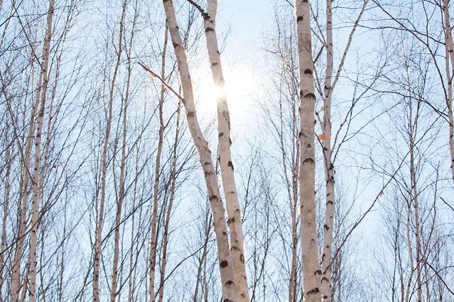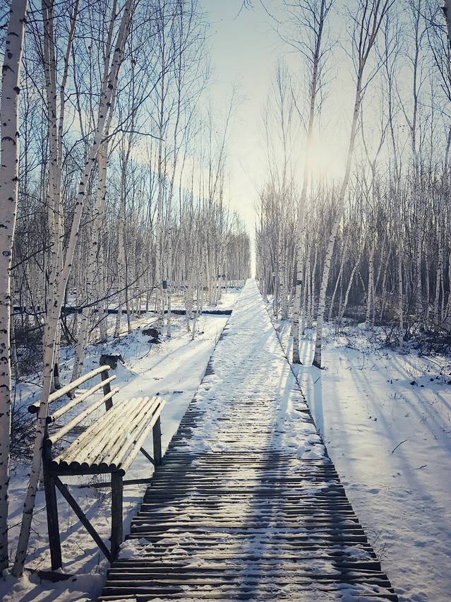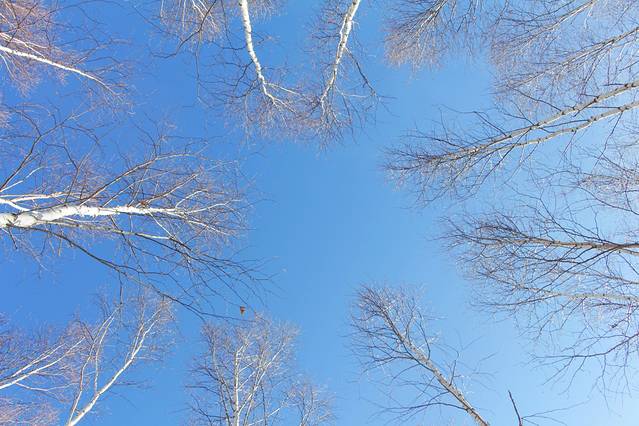 我印象中南方是没有白桦树的,这种树木也许能在北方存活。记得小学四年级的时候,老师要求我们写作,自己选一个树木写。我选择了白桦树,老师很疑惑的问我,你见过白桦树吗?我已经忘记当时怎么回答了,只记得当年偷懒的我只在作文本上写了一个题目“白桦树”和那么几个字“白桦树的树皮是白色的”。现在终于见到了白桦树,在初冬的北方,白桦树的树皮果然是白色的,在深蓝色的天空背景下,显得格外圣洁。阳光从白桦林的缝隙里透进来,照在我们微微扬起的脸上。