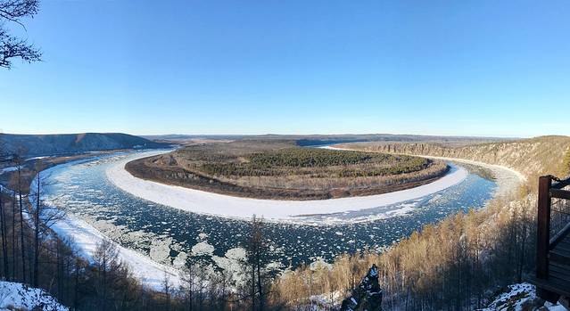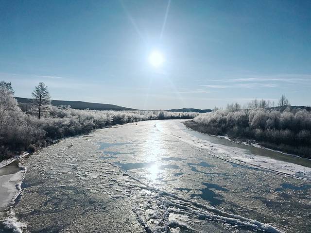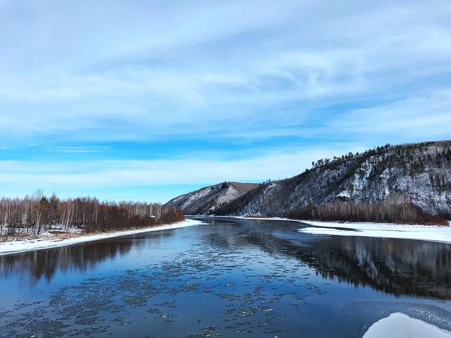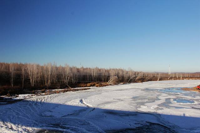 龙江第一湾,据说是黑龙江的流域的第一个弯道,到那边已经是临近中午。这是我和黑龙江的第一次邂逅,黑龙江就如一个少女,静静的述说着几千年的故事。不知道是不是因为天气的原因,黑龙江的水显得特别蓝。一块块白色的浮冰点缀在水面上,非常美丽。据说江对岸的那个岛屿就是俄罗斯境内了。