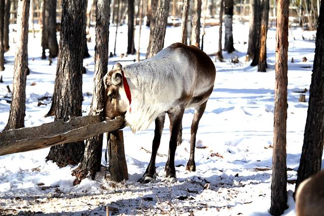 驯鹿园位于林区之中,一道简易的木门,几个小屋,非常简单。第一次见驯鹿,而且还可以亲密接触,内心还是有些激动的。走进了驯鹿圈,驯鹿看到我手上的苔藓瞬间就围了过来。驯鹿很温顺,和驯鹿呆在一起,看着它们温顺的眼神,内心也平静了不少。值得注意的是,在鹿圈中和鹿玩耍要小心它长角的误伤哦。