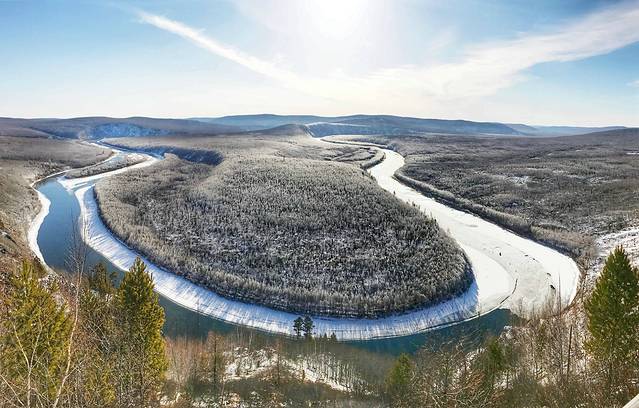 大兴安岭的河流的弯道好像非常多,除了之前的龙江第一湾,还有位于额木尔河的神龙湾景区,而我们今天上午的行程就是神龙湾。神龙湾景区包括了男脚湾,女脚湾和神龙湾,额木尔河在这片冰雪大地上刻画出了一块块优美的图案。
