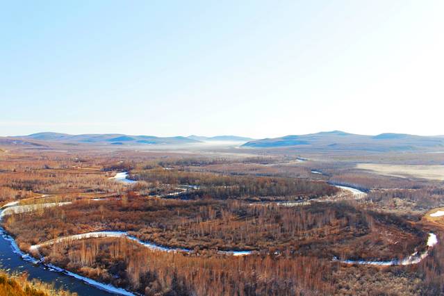 远远的,一座中式的瞭望塔傲人的挺立在一片白雪苍茫之中,在这片洁白世界里,鹤立鸡群。站在瞭望台上,远眺就是漠河的九曲十八湾湿地公园了。由于是冬天,林子显得有些灰暗。冬日的太阳照射在林子上面,升腾起一阵雾气。在林子中间一个,一条小河蜿蜒而上,曲曲折折,如一段银带,在太阳光下反射着银光,把这片林子里裁剪成精美的图案。