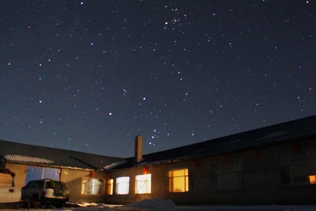这里没有路灯,所以没什么灯光污染,星星就显得格外明亮了。我们住在村里的其中一所所谓的宾馆。当天睡的是炕,对于来自南方的我而言也显得非常新鲜。北方的房子都有暖气,我们住的宾馆为了防寒,在窗户上贴了一层保鲜膜。一直听说北方的冬天房间里不冷,果然是的。