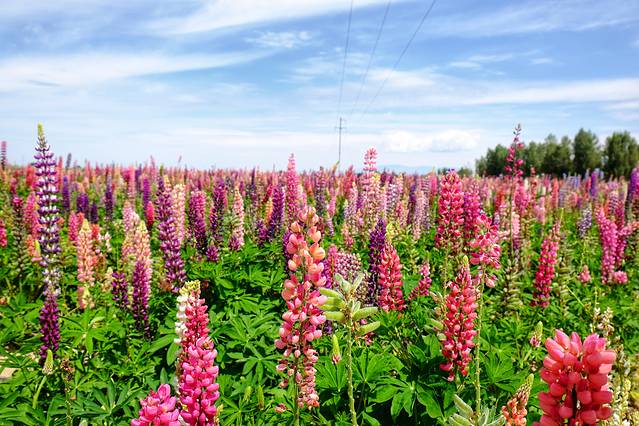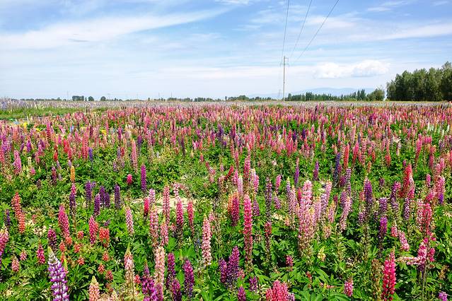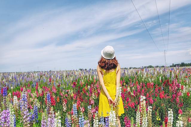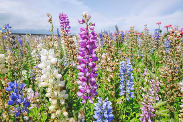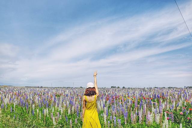 这片呈紫红、靛青、淡紫的鲁冰花田开在国道两旁,异常的美丽。当地人把它们圈了起来作为一个景点,每人5元不等的门票就可以近距离和花田拍照。兴奋的我早已跳入了花海中。