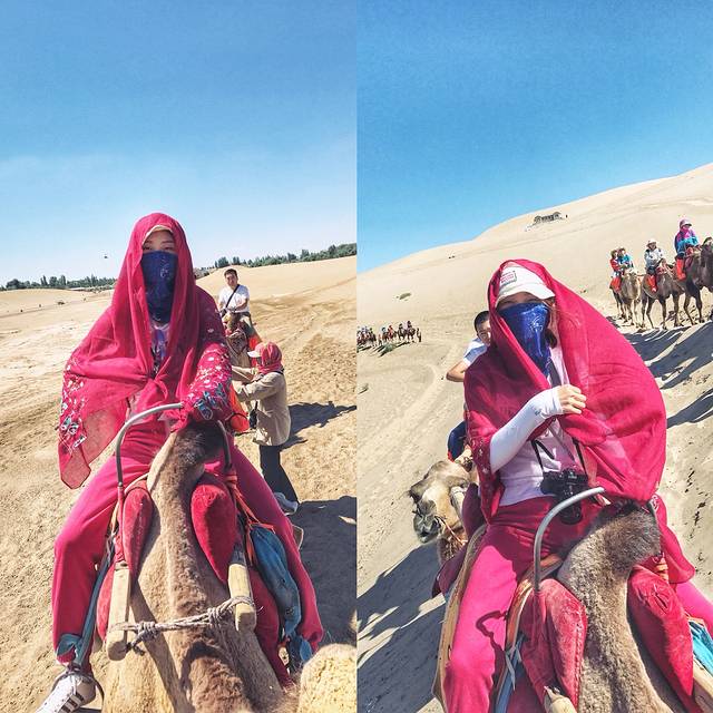 第一次骑骆驼,又兴奋又担忧,我扛着相机坐在上面一直被晃悠,可以放一首慢摇一直摇摆。风沙大,我得一边捂着纱巾防晒伤一边拿好相机拍摄,不容易。