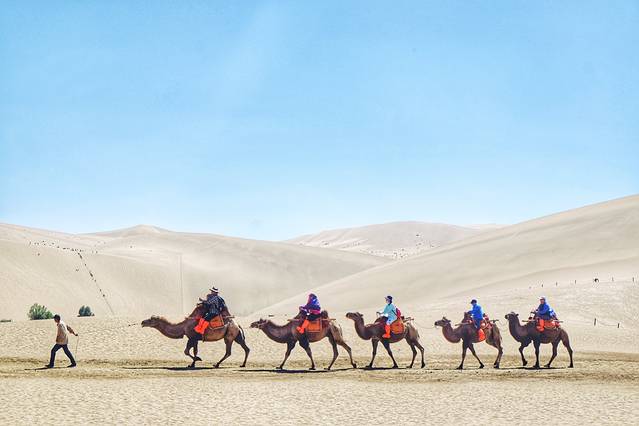 有3000多年历史的鸣沙山,沙峰起伏,金光灿灿,宛如一座金山,像绸缎一样柔软,少女一样娴静。在鸣沙山骑骆驼几乎是每个到访游客都会尝试的事情,骆驼票售价¥100/人,会由一名景区里面的员工当领队,牵着4头骆驼,带领进去鸣沙山,全程半个小时都不到。景区内需要付费的项目太多了,捂紧钱包就对了,你去了会体会到的。