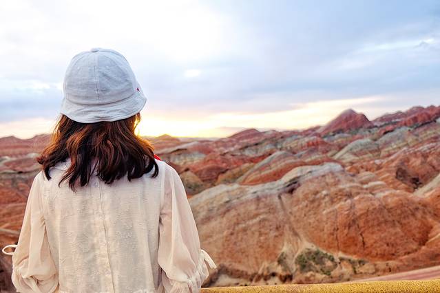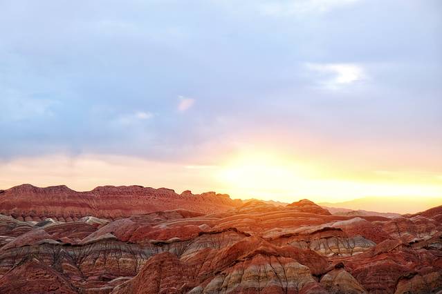 张掖七彩丹霞,色如渥丹,灿若明霞,高峰壁立。神奇的丹霞地貌,这里数以千计的悬崖山峦呈现出鲜艳的丹红色和红褐色,若前一天下过雨,这一天阳光出来照耀下的丹霞地貌更加色彩斑斓。