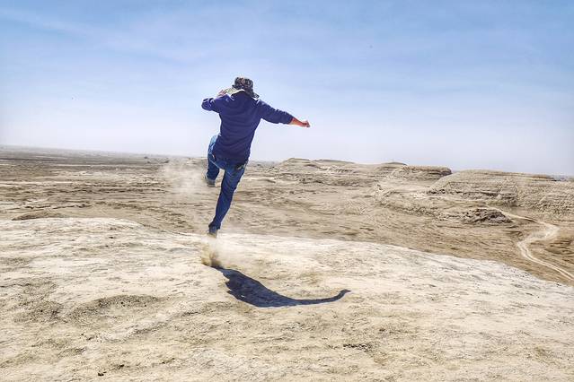 我们的司机大哥来了好兴致,乘风而起,腾步走沙,俨然有练过一身功夫。