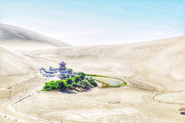 月牙泉古称沙井,俗名药泉,自汉朝起即为“敦煌八景”之一。为了上去高一点的地方拍到月牙泉全景,爬沙丘有点累,它禁锢了我的行动力。上到半山腰我就不想继续爬了,和负责滑沙的工作人员坐一起,望着沙丘下的月牙泉发呆,紫外线再大也晒不黑我,我可顶着帽子呢。