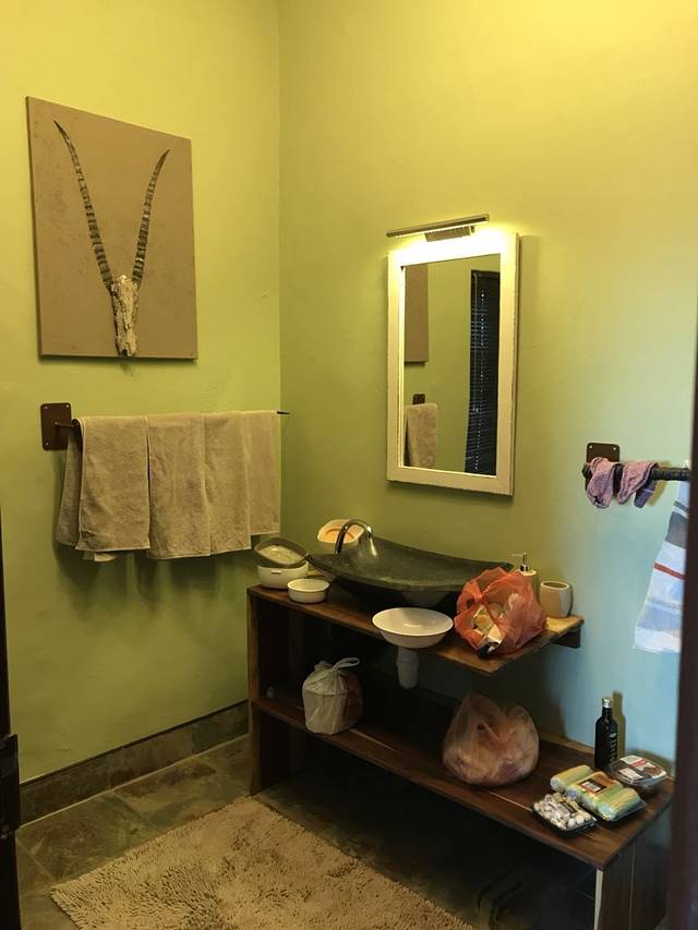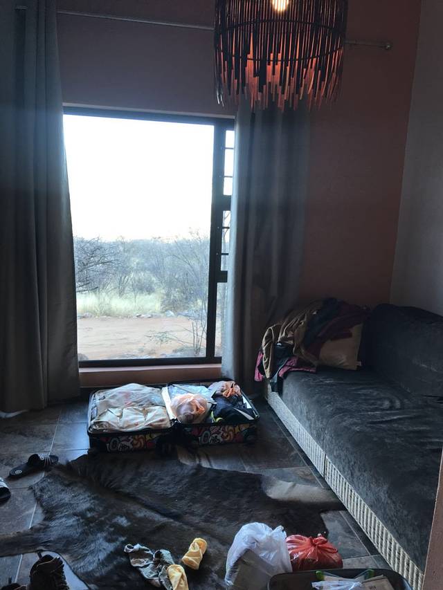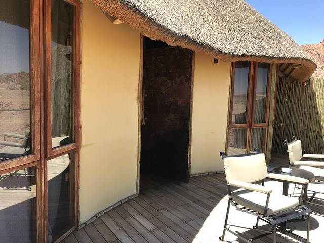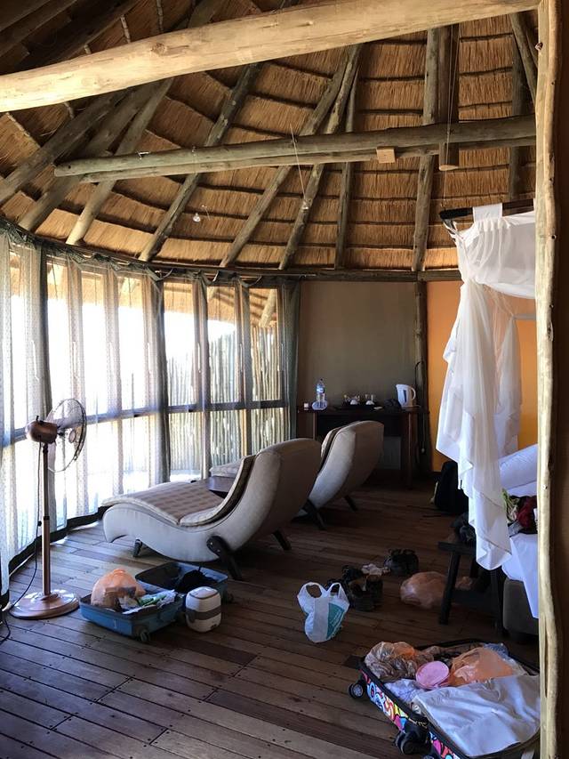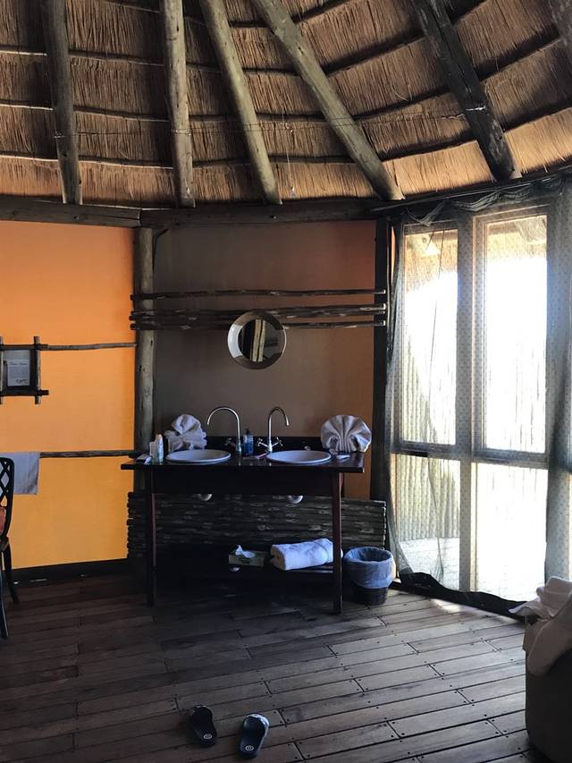 茅草屋有两个房间,一个大点的是卧室,有床还有躺椅,略小点的是洗漱间。对着荒原的一溜落地窗户,外面还有一阳台。私密性蛮好,只有荒原和荒原里的动物。如果能把车开过来确实就没办法保证这样的私密性了。