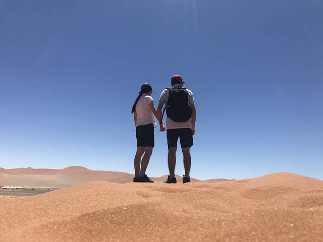早餐后离开直接去了45号沙丘,顶着大中午的阳光,背着食物喝水。不过45号沙丘是可以开到山脚下的,难度很低,八蛋恐高。后半程完全都是九蛋给拉着上去的,还得一路安抚,顺带一路探讨为什么昨天没有恐高,还能很high的尝试滚下去的感觉。