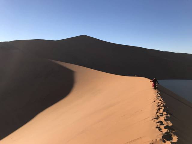 两个没有水喝食物还抗这重疙瘩的家伙顶着出来不久的耀眼的太阳爬沙丘,早上起得早还没吃早饭,凄凄惨惨戚戚,不过想着明天还呆一天大不了明天早上再来。(事实是想太多了,第二天根本没有来。)路上遇到两个在这个国家工作的中国姑娘,互相帮忙拍照片,很热心的说提供一瓶水给我们俩,压根不敢要啊,其中姑娘辛辛苦苦背上来的两瓶水给我们一瓶哪敢收啊,好在我们想着明天再来并担心没有收掉的帐篷所以打算过一会就离开回去。
