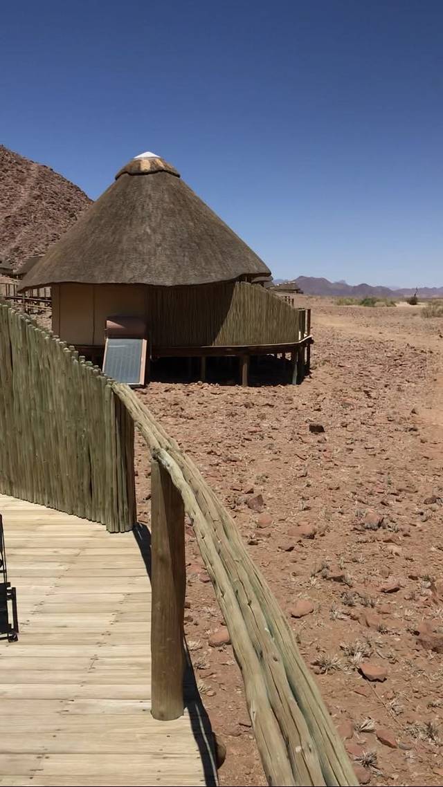 这是红沙漠里面唯一的一家酒店,一共24个茅草屋,也就是一共24个房间,一间背靠沙丘面朝荒漠的独立茅草屋就是一个房间。茅草屋都是架空不与地面直接接触的(大约1米多),私密性很好,茅草屋和餐厅之间用木制(应该是木制)廊道了解。这个酒店也有泳池(貌似真的都有泳池,我也不知道为什么)。