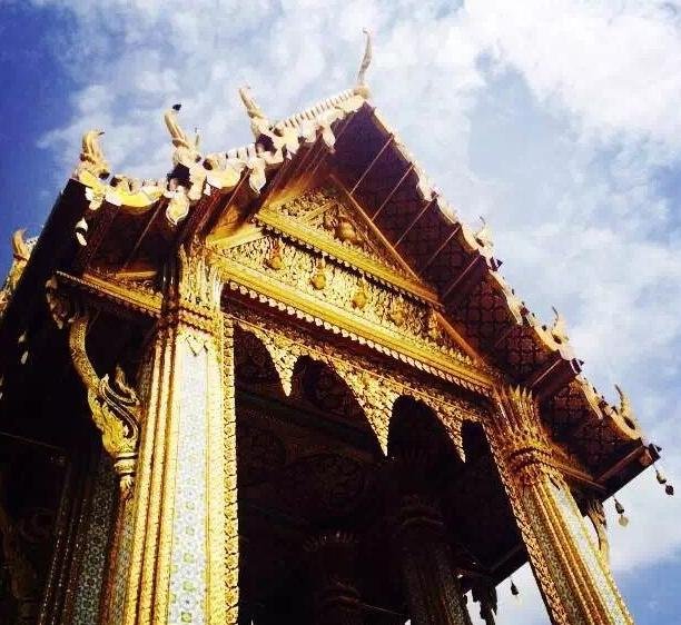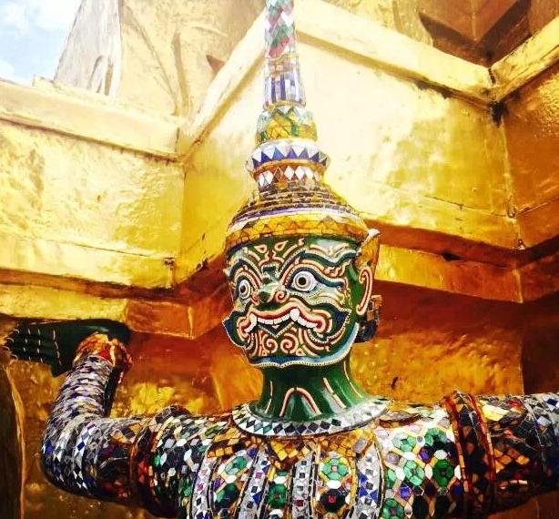 到了大皇宫,最大的感受:人多!更大的感受:中国人多!感觉基本上被中国的旅行社包围了,没办法,这是到了曼谷必去的地方呀,总体感觉还好,金灿灿、尖尖顶,也算体验一把泰式的建筑风情。泰国人爱笑,所以门口的石雕守卫也爱笑,看上去和中国宫殿的严肃截然不同。从码头到大皇宫的那天小路上都是买吃的和工艺品的,相信自己眼里的朋友不妨去淘个宝吧。