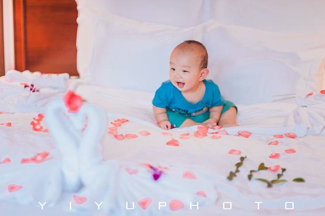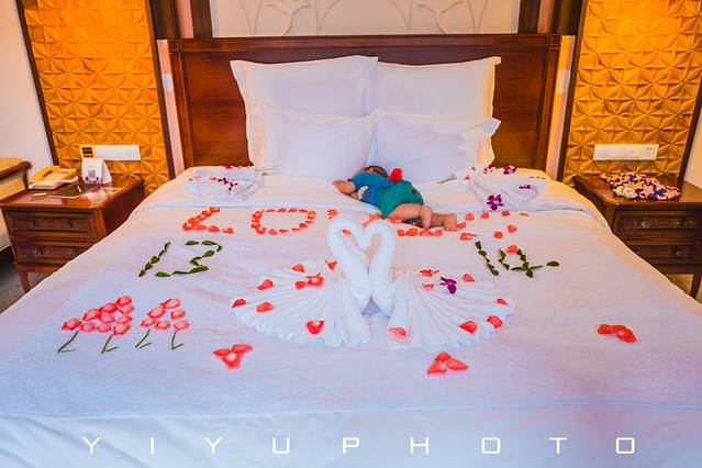 到酒店就开始收拾行李、给他做热水做辅食收拾行李,手忙脚乱地收拾一番胖胖就醒了,刚醒来的他显然不知道这是什么状况,床上莫名的花瓣和装饰让他楞了很久,把我和妈妈逗得笑到直不起腰。赶快掏出相机拍下了他萌萌的一幕。