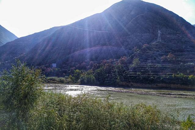 这个路啊好像是一会儿在四川境内,一会儿在甘肃境内,景色也变化,一会儿山上长满了植物,一会儿又是存草不生,黄黄的大秃山,但是气质巍峨特别有气势,沿途的风景那是美的不得了,特别是舟曲境内,蓝天、白云、白龙江滔滔流淌,路边的降红色的柿子树结满了果实,格桑花随风摇曳,农户家的架子上挂满了金灿灿的玉米……。