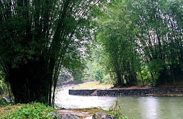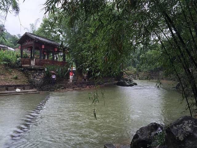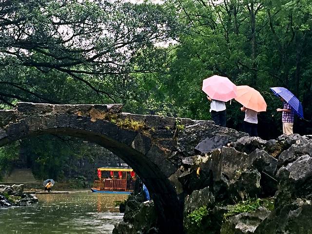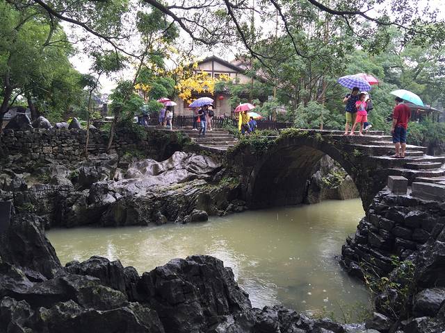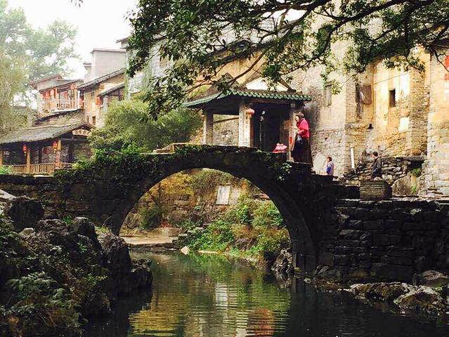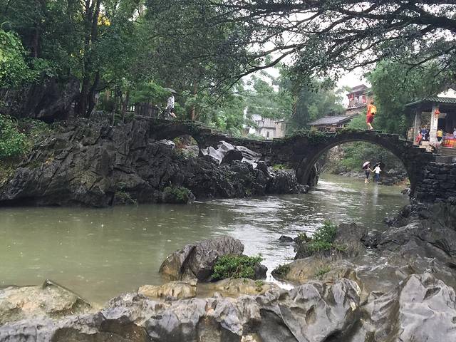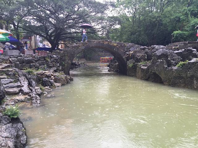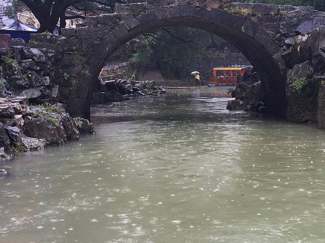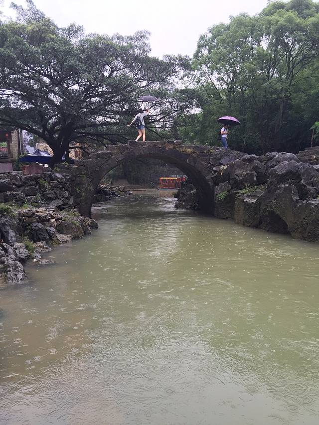 这里就是带龙桥,往日清清的溪水变得混浊起来,游人们打着花伞在桥上走过,给着古老的桥增添了靓丽。