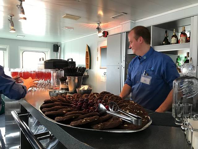 船方在努力营造一种大家庭的感觉,开始的时候,每个人都带着写有自己名字的胸牌,这样大家很快就认识了,互相称呼名称;船舱门从来不用关,除非你在里面睡觉。工作人员跟我们一起吃饭、聊天,大家像朋友一样。这样大家很快就融洽起来,真的很像一个大家庭,这种氛围在我们中国人里是永远不会有的。