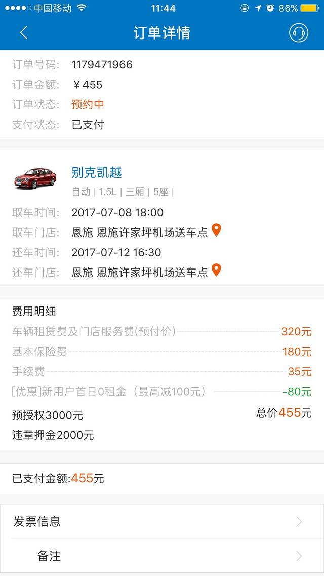 租车时间: 2017-07-08 18:00 ~ 2017-07-12 16:30