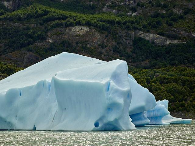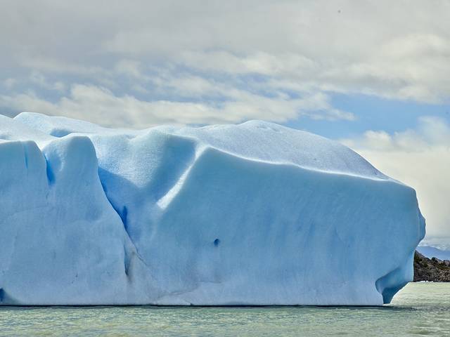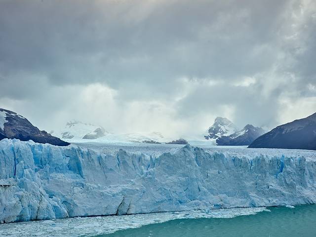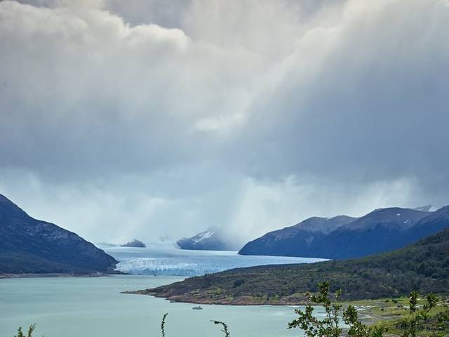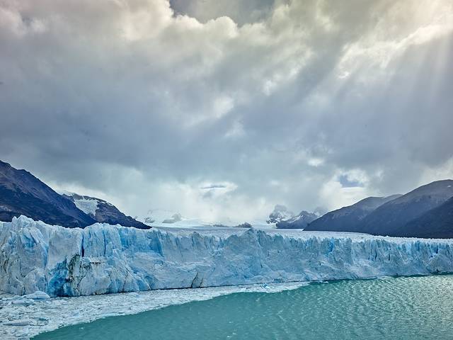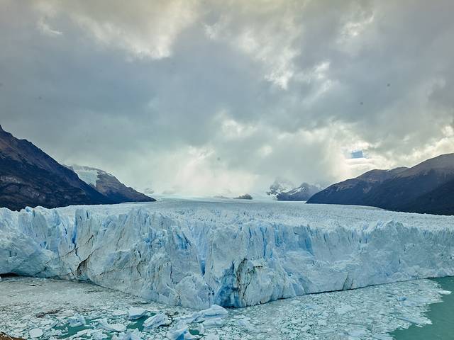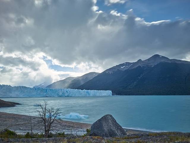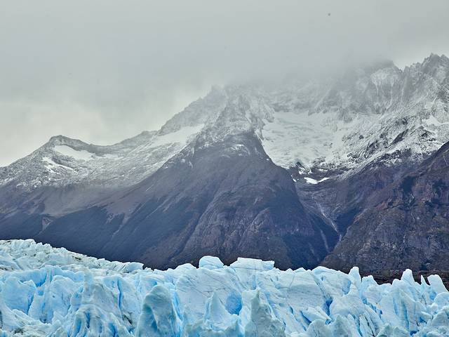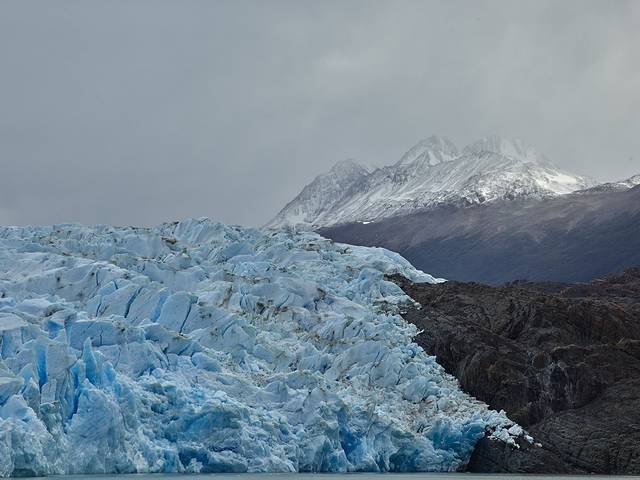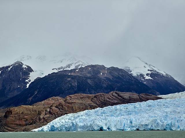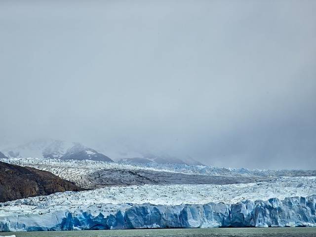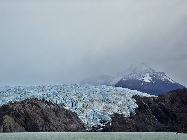 住的酒店正好有卖冰川船票的,昨天回来就把船票买了,今天坐船去冰川。坐船的地方离酒店很近,开车几分钟就到了,停好车,还要在干枯的河床上走一段,才能走到上船的地方。在格陵兰空中俯览过冰川,在冰岛徒步过冰川、去过南极、前几天又在阿根廷看过壮丽的大冰川,所以,这个冰川看起来真的没觉得怎样,当人们惊呼的时候,我却镇静的出奇。天阴沉得厉害,远处的雪山掩映在云雾中,有点水墨画的赶脚。最搞笑的是,我在甲板上照相,边上一个身子长腿短的老外用iphone录像,特别不开心的对我说,我在录像,那意思,我拍照的声音影响他同期录音了,当时真的很错愕,你真以为你拍电影呢?还同期声?关键是,这是公共场所,我也没有大声喧哗,你总不能不让我的相机出声吧,但是,我还是说,你先来。结果他录起来没完,完全无视等在边上的我,我真的马了。把我知道所有的带脏字不带脏字的国骂都大声的过了一遍,我让你同期声。哈哈,如果他好学,回去找明白人翻译一下,估计来中国吵个架啥的肯定没问题。
