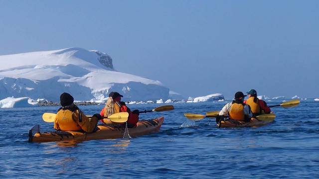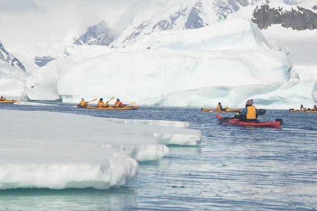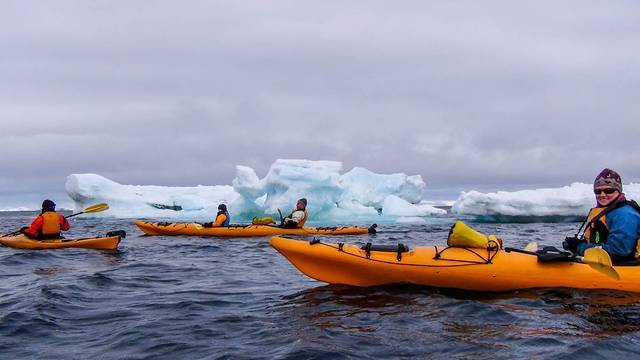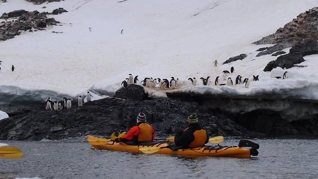 这个岛真的很脏,雪被企鹅粪便弄得都是粉色的,而且,味道非常大,又下雪,一到雨雪天气,我就没有拍照的兴趣,突然就感觉一分钟都不想呆,只想赶紧离开。拍完帝企鹅,就去划皮划艇了,因为上岸耽误了时间,所以大家都拼命地划,划到目的地,其实也没啥可看的,却把我累得快吐血了,我这小臂力呀。