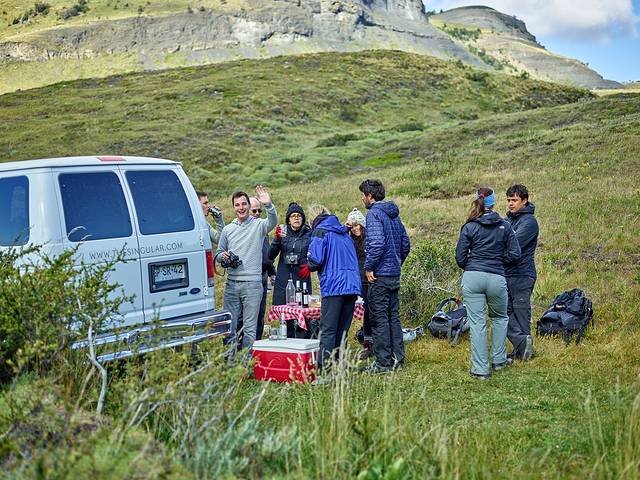 一顿吃吃喝喝后,悄悄的潜回我的房间,只把房门推了一条小缝,就看见两条大毛腿在那晃悠,吓死宝宝了,赶紧关上房门悄悄溜走,姐决定睡车里。我在澳洲因为没订上酒店,曾经睡过四人房和车里,车里真的睡得香。于是这100美金我只上了两次厕所。把车又开到山脚下,打算半夜如果遇见疯逼小分队就尾随上山,姐是有备而来的,有头灯。这个时候已经开始下雨了,到一点的时候雨越来越大,也真有不作不死小分队顶着头灯上山,但是我没尾随,我虽然二虽然疯,但作死的境界我还没到。最最关键,虽然百内天气风雨雷电一天三变,但是我还是不相信,这么大的雨,明天能看到日照金山。于是,踏实睡去,但是,这里真跟澳洲不一样呀,恨不得把所有衣服都穿身上还是冷,这破车,着车如果不开动,热风不太管用,我又怕中毒不敢一直开。