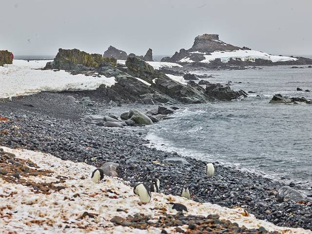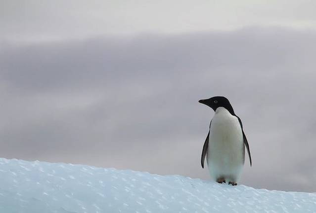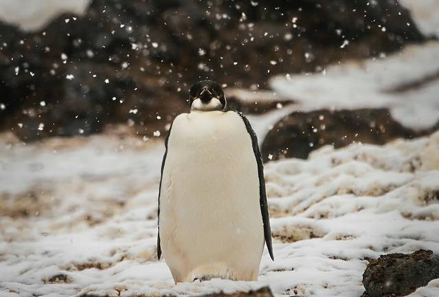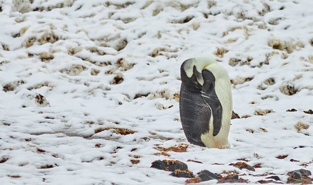 今天又是大雪,这个岛也真的很脏,那帝企鹅据说是只走失的企鹅少年,不满两岁,那么大的个子,就这么孤独地站在那里,非常另类,非常格格不入。而且,我很担心,它就这么离群走丢,应该生存不了多久吧?当时有些小小的忧伤。