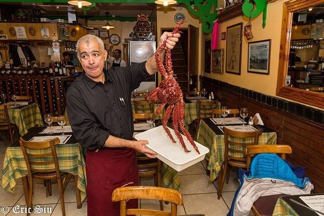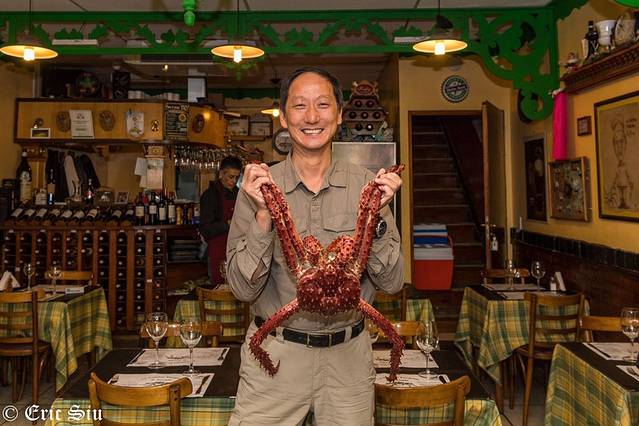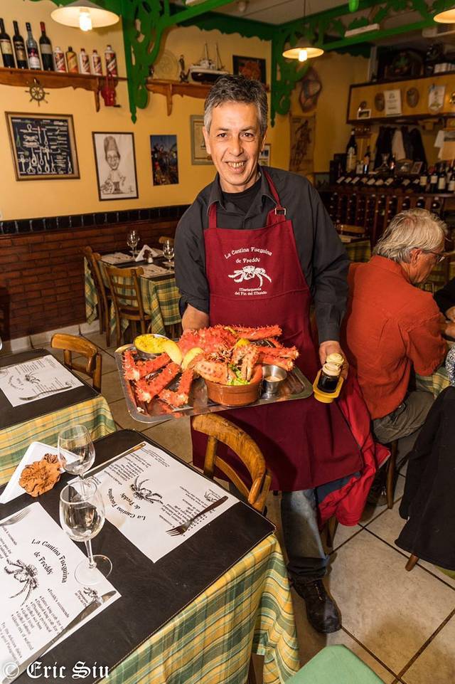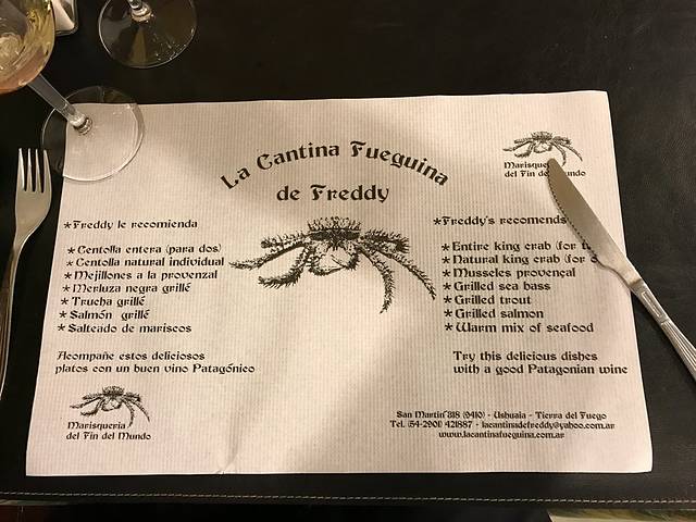 终于等到7点半,在乌斯怀亚街上,一共有三家餐厅门口有水族箱卖帝王蟹,有一家厨师已经在里面工作了,但是却不给我们开门,另外一家,里面漆黑一片,正当我们向里张望的时候,老板从外面走了进来,把门打开,我们就跟着走了进去。不是7点半营业吗?这是7点半才开门好吗?这要是在我们中国,至少6点厨师服务员就都到了呀,南美呀南美。老板问我们有预定吗?我们说没有,但是老板犹豫了一下还是让我们坐下了,可能觉得中国人能吃吧。因为后面进来的老外,因为没有预定就被拒之门外了。