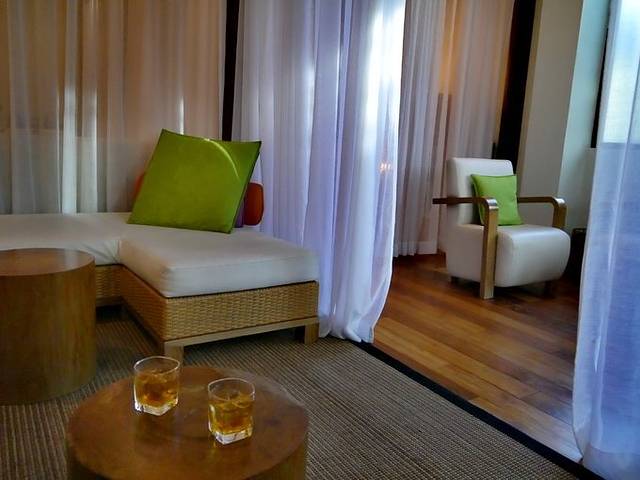我们这5天里,酒店冰箱里提供的汽水一概不喝,就去酒吧里点鸡尾酒、鲜榨果汁、和现调的无酒精乳饮料,对着海边一坐,吹着海风,真的超级惬意,这也是我推荐给你们的原因之一。午餐和晚餐都可以直接喊服务员,为你们夫妇开一瓶最好的红或白葡萄酒,选好后开瓶,就把酒架在你的餐桌旁,随喝随倒,如果你们既是吃货又是酒鬼,那么恭喜你们,你们一定选择对岛屿了。