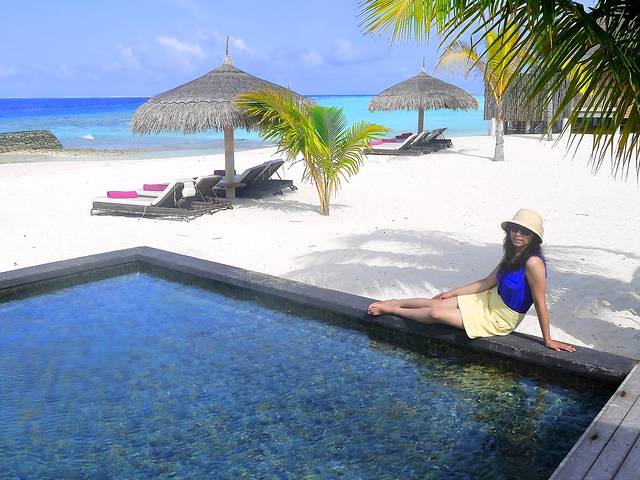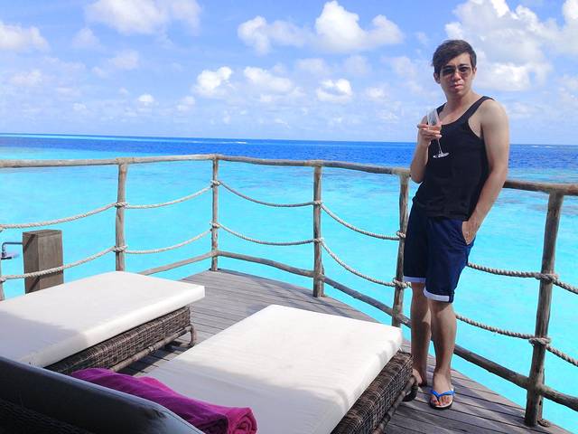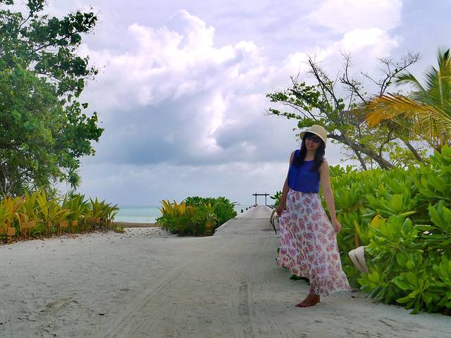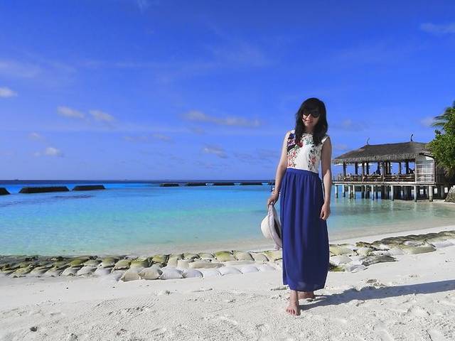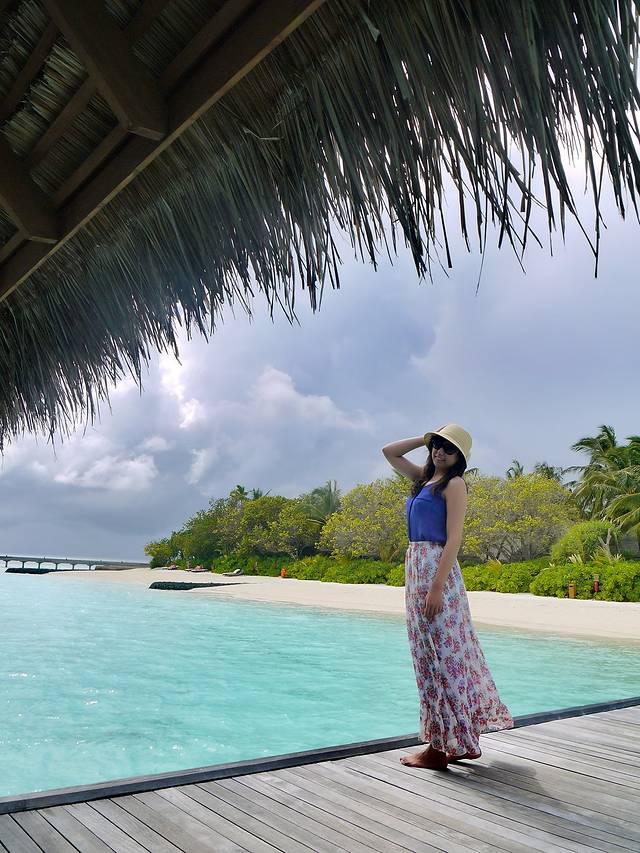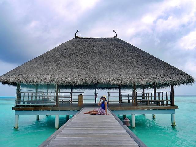 岛上每天的生活就是三餐、浮浅、拍照、酒吧喝酒这几样简单的生活方式,却意外的并不觉得单调。彻底脱离手机、电视、过着神仙的日子。今儿又是放晴的一天,马代印度洋的海水有时你会通过照片发现,有人照出来就是蓝色的,有人照出来就是翠绿色的。其实多半它的海水颜色靠阳光衬托。阳光紫外线强烈时,衬得海水就是蓝的不成样子,如果多云,海水映衬为翠绿色。趁着还没有晒黑,就多留念几张吧,可以忽略模特,大家欣赏一下美景。今天拍摄的地方主要是岛的豪华水屋区域,偏岛屿最西边。