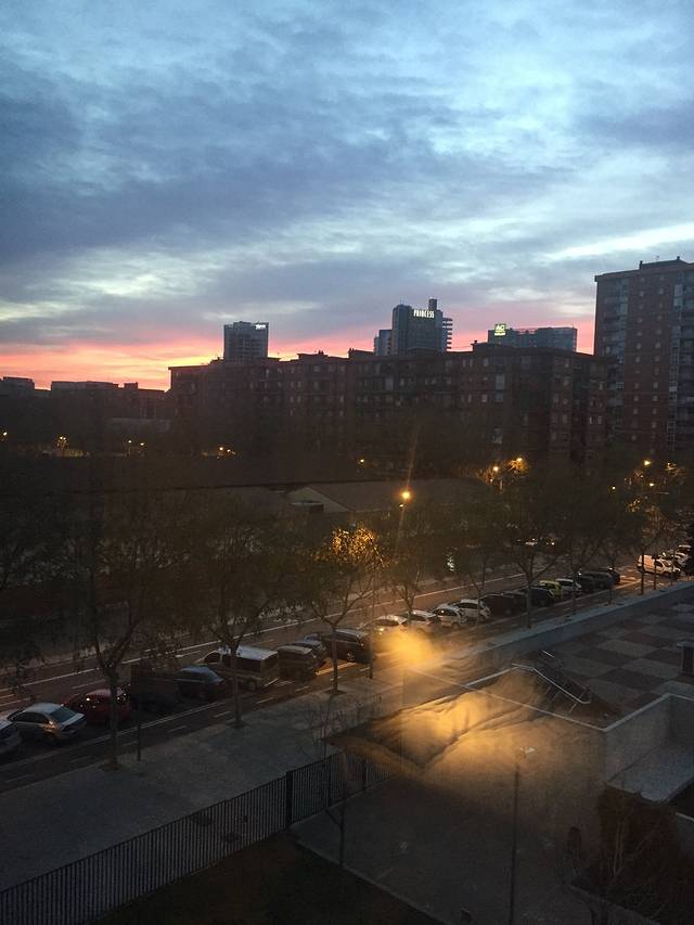 因为预定的圣家堂登塔时间是10点半,所以两个接待女孩来了之后,我们就急急忙忙地赶到了圣家堂,酒店是这边的接待公司订的,比较远,在巴塞罗那新区,我早晨因为时差睡不着,正好窗外日出,我就随手拍了一张,发给了北京的朋友,结果那大姐来了一句,别跟我吹牛逼你在西班牙。哈哈,其实呢,真的跟亦庄开发区一样呀。